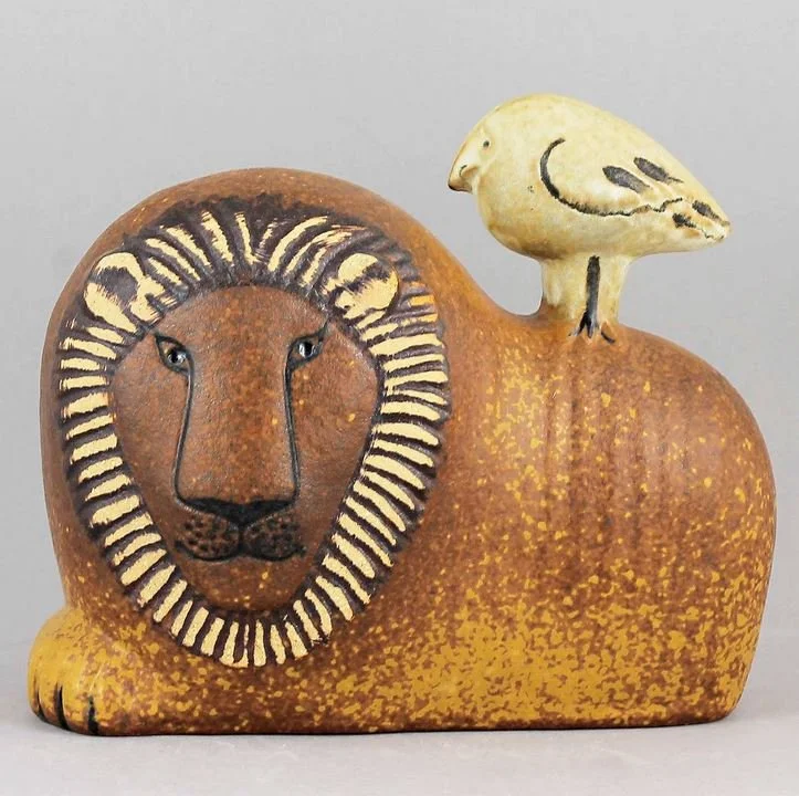 Lisa Larson laid-back lion with a bird. Hand decorated. Larson designed the lion in the 1990s at Keramikstudion Gustavsberg in Sweden. Later production. Artist Lisa Larson; Name Lion with Bird (Lejon med fagel); Design Year 1990s; Maker Keramikstudion Gustavsberg in Sweden; Material Stoneware; Height: 5.1 inches, Length: 6.3 inches, Depth: 3.5 inches. Price: SOLD