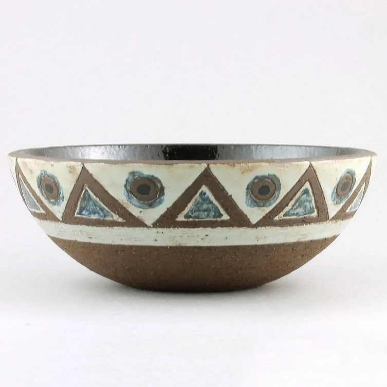 Inger Persson's bowl with a rounded form, dark brown clay, and surface, and colorful geometric decorstion. Hand crafted in the 1960s at the Rörstrand studio. Artist Inger Persson Year 1960s Maker Rörstrand studio, original production Material Stoneware Size Diameter: 9.4 inches Height: 3.5 inches. Price: $230