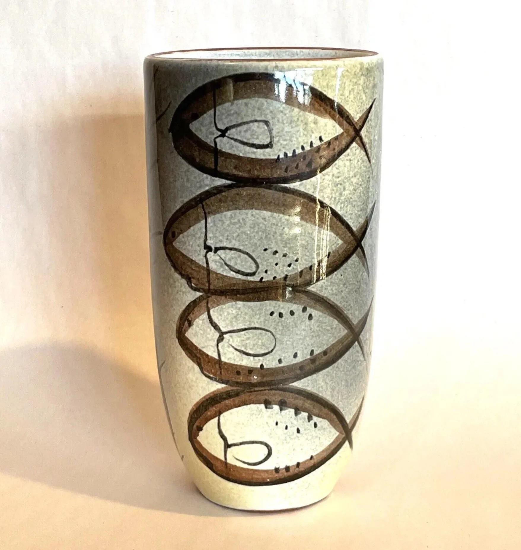Ingrid Atterberg Manet series Mid Century Modern hand painted art pottery vase.  Ingrid Atterberg (1920–2008) designed many classics for the Swedish Upsala-Ekeby company in the 1940s to 1960s. One of the most well-known series is Manet (Jellyfish) manufactured from 1951 to 1954. It consists of 10 earthenware bowls and vases. Incised on bottom: Abg (Atterberg), UE (Upsala-Ekeby), and 2121 (shape number). Made in Sweden and UE ink stamps. Size approximately: Height 6.5”; Width 3.25”; Depth 2.5”. Price: $110