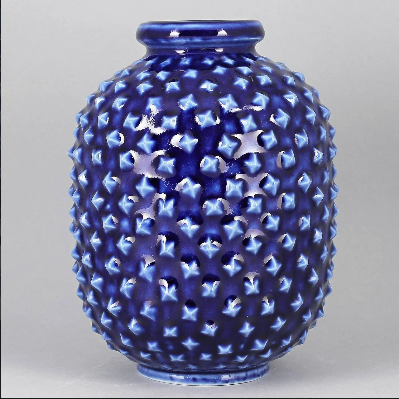 Gunnar Nylund cylinder vase with spiky rivets in a glossy cobalt glaze. Designed in 1951 for Rorstrand. Maker: Rorstrand, original production. Factory first quality; Size: Height: 5.9 inches; Diameter: 3.9 inches; Marked: Rorstrand, GN (Gunnar Nylund). Price: $375