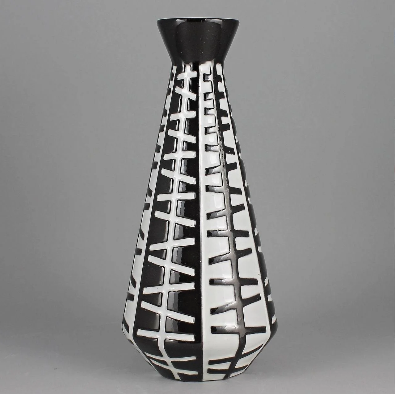 Ingrid Atterberg geometrical relief pattern cone vase designed in 1958 for Upsala-Ekeby. The vase is hand decorated in a glossy dark brown and white glaze. Maker: Upsala-Ekeby, original production; Size: height 8.3 inches, diameter: 3.9 inches; Marked: Upsala-Ekeby, Abg (Ingrid Atterberg). Price: $260