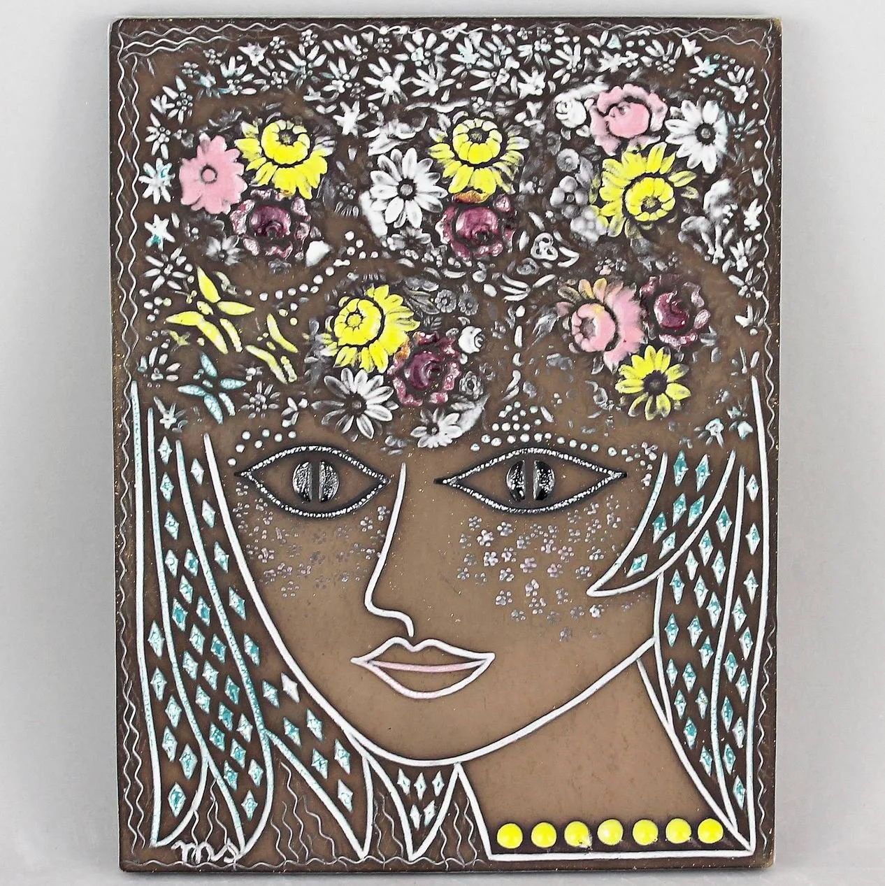 Mari Simmulson's wonderful wall plaque with rectangular form and hand decorated parts in pastel colors. Mari Simmulson (1911-2000) is one of the well-known representatives of the illustrious Swedish ceramic design of the 20th century. She was one of the leading designers for Gustavsberg and Upsala-Ekeby in the 1940s-1960s. Simmulson is represented at the Swedish National Museum of Art and Design. Maker: Upsala-Ekeby, original production; Size: Height: 7.5 inches; Width: 5.9 inches. Mark: Upsala-Ekeby, MS (Mari Simmulson). Price: $150